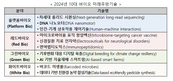 과학기술정보통신부(장관 이종호)와 한국생명공학연구원(원장 김장성, ‘KRIBB’)은 지난 26일 바이오 분야의 미래 비전을 제시하기 위한 ‘2024년 10대 바이오 미래유망기술’을 발표했다.
