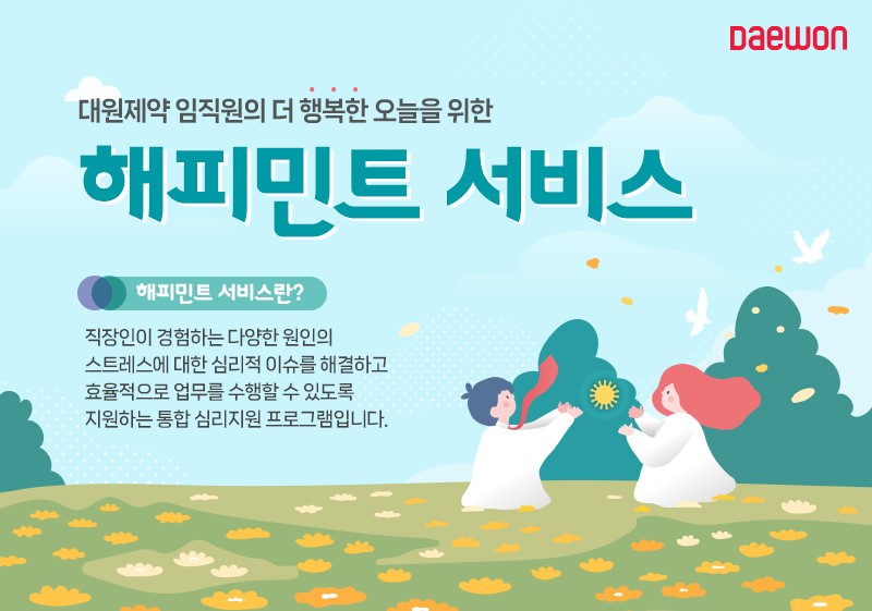 대원제약 임직원이라면 '직장 내 대인관계', '직무 스트레스', '조직 적응' 등 회사 관련 문제나 '부부·가족 관계', '자녀 양육' 등 관련 문제를 포함 개인이 겪은 일 등 모든 심리상담을 받을 수 있다.