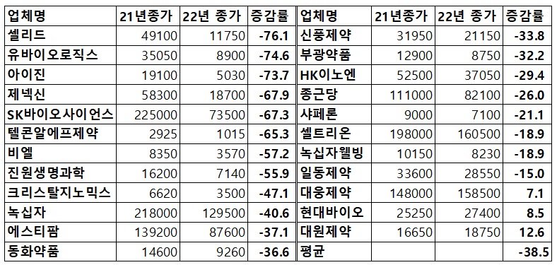 지난 1년간 주가가 평균 30% 가까이 하락한 만큼 대부분의 제약사들이 주가 하락을 경험한 셈이다. 여기에 2020년부터 본격화된 코로나19 치료제와 백신 개발을 진행하던 업체들 주식 상황은 더 나빴다.