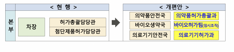 의약품과 의료기기의 경우 허가 담당 부서가 정규 직제로 편성됐지만, 바이오의약품은 허가 건수가 상대적으로 적다는 이유로 임시조직으로 편성됐다.