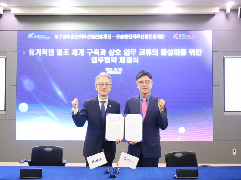 오송첨단의료산업진흥재단(KBIOHealth·이사장 이명수)은 30일 대구경북첨단의료산업진흥재단(이사장 박구선, 이하 K-MEDI hub)과 바이오헬스산업 분야에서의 유기적인 협력 체계 구축을 위한 업무협약(MOU)을 체결했다고 밝혔다.