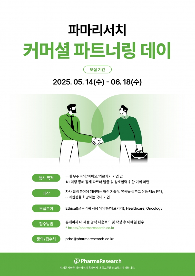 파마리서치는 "자회사 '파마리서치메디케어'와 전략적 협업을 추진하기 위해 6월 18일까지 '커머셜 파트너링 데이' 참가기업을 모집한다"고 15일 밝혔다.