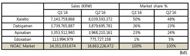 IMS 2016년 상반기 자료에 따르면 국내 신규 경구용항응고제 시장은 올해 1분기 143억 5103만원을 기록했고 2분기에는 166억 6322만원으로 23억 정도 증가했다.