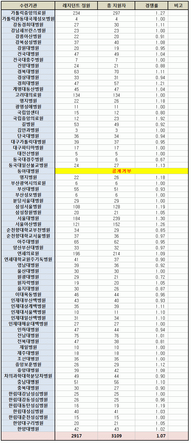 그 밖에 1.00:1 이상 지원율로 마감한 기관은 ▲가톨릭국제성모병원 ▲강동경희대병원 ▲강남세브란스병원 ▲강북삼성병원 ▲건국대병원 ▲건국대충주병원 ▲경북대병원 ▲경희대병원 ▲계명대동산병원 ▲고려대의료원(통합) ▲명지병원 ▲광명성애병원 ▲김안과병원 ▲대구파티마병원 ▲대전선병원 ▲동국대일산불교병원 ▲부산광역시의료원 ▲부산성모병원 ▲분당서울대병원 ▲삼성창원병원 ▲상계백병원 ▲울산대병원 ▲원자력병원 ▲서울백병원 ▲일산백병원 ▲해운대백병원 ▲전남대병원 ▲제일병원▲제주대병원 ▲조선대병원 ▲중앙대병원 ▲중앙보훈병원 ▲충남대병원 ▲한림대강남성심병원 ▲한림대동탄성심병원 ▲한림대성심병원 ▲한림대춘천성심병원 ▲한양대구리병원 ▲한양대병원 등이다.