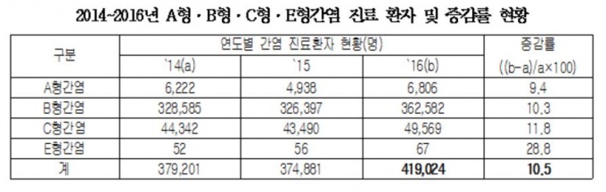 국회 보건복지위원회 간사인 국민의당 김광수 의원(전북 전주시갑)이 건강보험심사평가원으로부터 제출받은 자료에 따르면, 2014~2016년 3년간 A형·B형·C형·E형간염으로 진료 받은 총 환자는 2014년 37만9201명, 2015년 37만4881명, 2016년 41만9024명인 것으로 집계됐다.
