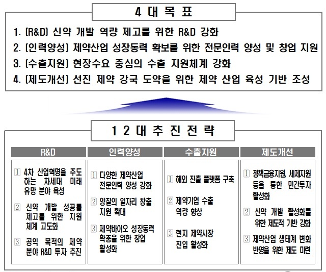 지난 제1차 제약산업 종합계획은 중소기업, 제네릭, 내수 위주의 국내 산업구조를 탈피하기 위한 전략 위주로 구성됐으나, 이번 제2차 제약산업 종합계획은 강소기업, 혁신‧바이오신약, 수출 중심의 혁신성장 선도산업으로 도약하기 위한 4대 목표, 12대 추진전략, 37대 실천과제로 구성돼 있다.