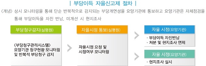 부당이득 자율신고제란 정부가 상시 모니터링을 통해 단순 반복적으로 감지되는 부당개연성을 요양기관에 통보하고, 요양기관은 자체점검으로 부당이득을 반납하는 것을 말한다. 요양기관이 지적사항을 개선하지 않을 시 정부가 현지조사에 나설 방침이다.