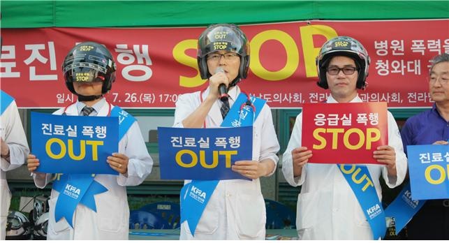 전남도의사회 선재명 정책이사는 ‘국민들게 드리는 호소문’을 통해 “의료현장의 폭력 근절을 위해 의료법의 반의사불벌죄 조항과 벌금형 조항을 삭제하고 특정범죄 가중처벌법 같은 강화된 법 개정과 함께 사법부의 실효성 있는 판결이 필요하다”며 “경찰도 의료현장에서 발생한 폭력에 대해 더욱 신속한 출동과 적극적인 대응을 해야 한다”고 주장했다.
