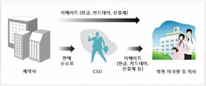 실제 검찰 수사결과 CSO 업체들은 제약회사와 높은 비율의 판매수수료를 약정하고 수수료 일부를 의사들에게 리베이트로 제공한 것으로 드러났다.