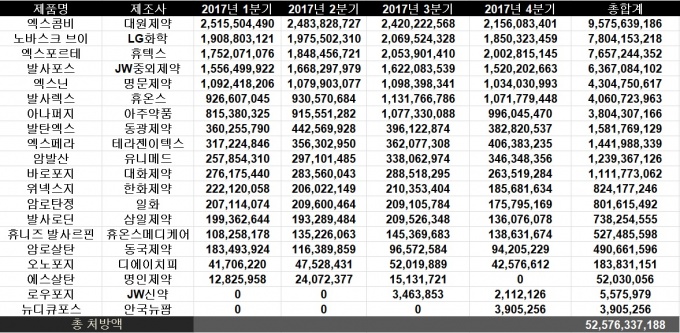 발탄엑스는 15억원, 엑스페라는 14억원, 암발산 12억원, 바로포지 11억원 순으로 집계됐다.
