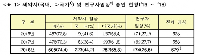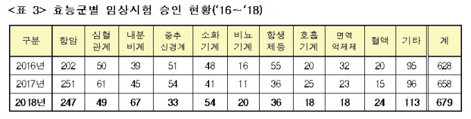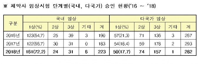전체 의약품 임상시험 승인은 2016년 628건, 2017년 658건, 2018년 679건으로 꾸준히 증가세를 보였다. 이 기간 전 세계 임상시험은 2016년 8090건, 2017년 7865건, 2018년 8386건으로 등락을 반복했다.