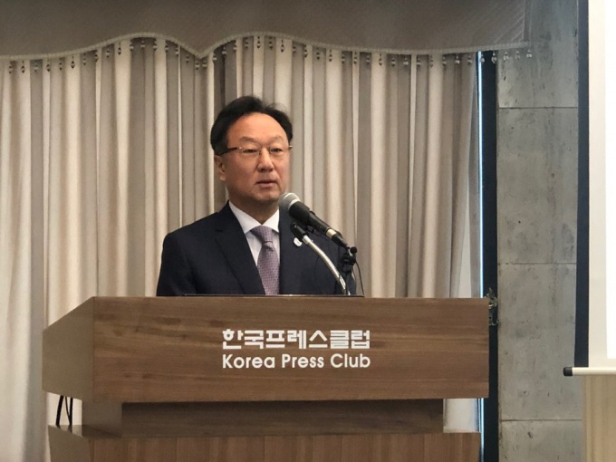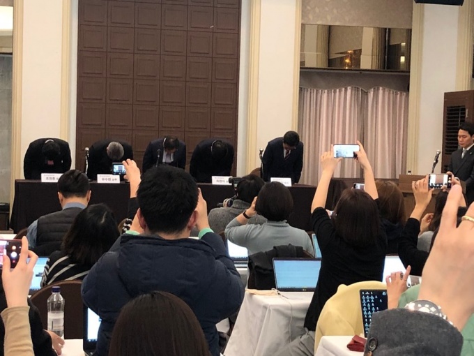 이우석 코오롱생명과학 대표이사는 1일 서울 프레스센터에서 '인보사케이주, 자발적 유통 판매중지에 관한 기자간담회를 열고 머리를 숙여 사과했다.