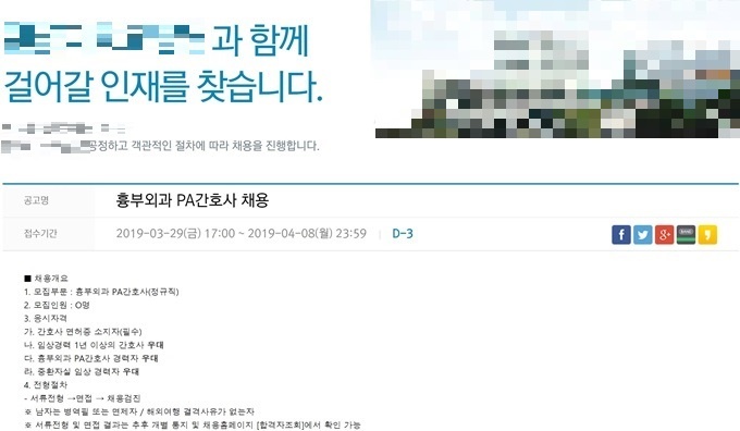 7일 H대병원에 따르면 병원은 지난 3월29일부터 오늘(4월8일)까지 흉부외과 PA간호사를 모집하고 있다. 모집인원은 ○명이고, 응시자격은 간호사 면허증 소지자·임상경력 1년 이상의 간호사 우대·흉부외과 PA간호사 경력자 우대·중환자실 임상 경력자 우대 등이다.