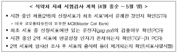 또 이번에 실시한 유전학적 계통검사(STR)에 이어 처음부터 신장세포였다는 업체 측 주장의 사실여부를 확인하기 위한 시험과 안전성 문제를 검증하기 위한 시험도 수행하고 있다.
