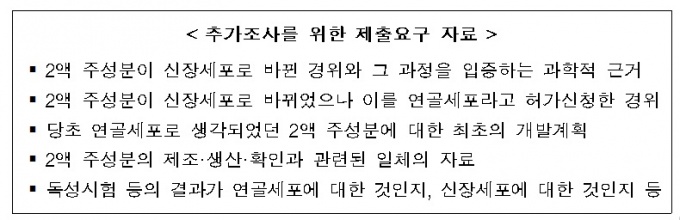 우선, 코오롱생명과학에 2액의 주성분이 연골세포에서 신장세포로 바뀐 경위와 그 과정을 입증하는 과학적 근거 등 일체의 자료를 제출하도록 해 이를 검토할 예정이다.