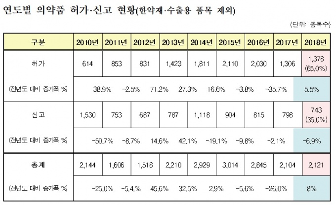 반면 제네릭의약품 허가는 982개 품목으로 2017년(954개 품목)과 유사한 수준이었다. 이는 작년 특허가 만료된 의약품 시장규모가 크지 않거나 염변경 등 특허 회피 전략을 통한 의약품 개발 영향으로 분석된다.