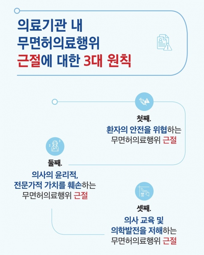 의사가 아닌 자의 불법의료행위 1차 근절 대상 목록에는 ▲신체에 위해를 가할 수 있는 침습적 행위(골수검사, 피부 및 조직절개, 봉합 등) ▲초음파, 내시경 등 단독검사 ▲의사 아이디(ID) 위임을 통한 처방 등이 제시됐다.