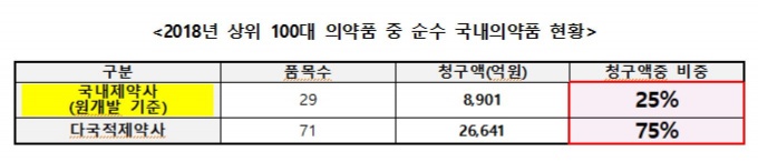 그러나 청구 상위 100대 품목에 대해선 국내사가 25%(8901억원) 비중을 차지한 반면, 다국적사는 2조6641억원을 청구하며 75% 비중을 차지한 것으로 나타났다.