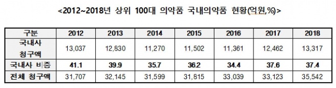 [데일리메디 박정연 기자] 최근 7년간 청구액 상위 100대 의약품 매출 대부분의 75%를 다국적 제약사가 점유하며 국내 의약품 주권이 우려된다는 지적이 제기됐다.