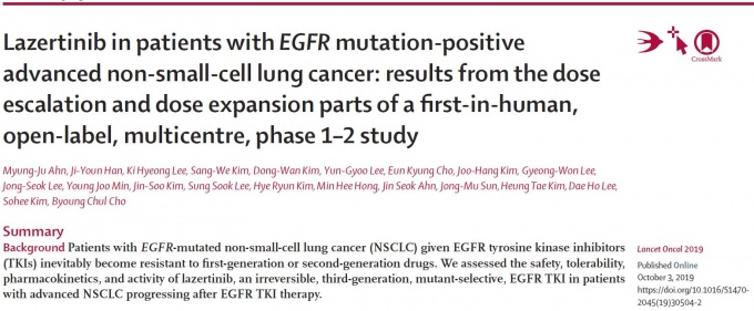 이번 논문에는 임상1/2상의 용량 증량 및 용량 확대 시험에서 2017년 2월부터 2018년 5월까지 모집된 환자 127명을 대상으로 레이저티닙 유효성과 안전성을 평가한 결과가 발표됐다.