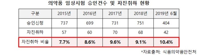 6일 국회 보건복지위원회 김명연 의원(자유한국당)이 공개한 자료에 따르면 지난 2015년부터 올해 6월까지 식약처에 의약품 임상시험을 신청했다가 자진 철회한 횟수가 297건이었다.