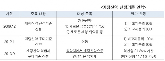 우리나라는 2008년 개량신약 산정기준을 마련하고 2013년 약가 우대기준을 신설해 당시 신약과 제네릭 중간 가격을 산정해 동기부여를 한 바 있다.
