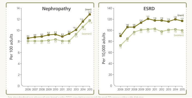 말기신부전 유병률 역시 2006년 대비 2015년에 당뇨병 환자 1만명당 남성이 90명에서 117명, 여성이 73명에서 100명으로 증가하는 추세를 보였다.