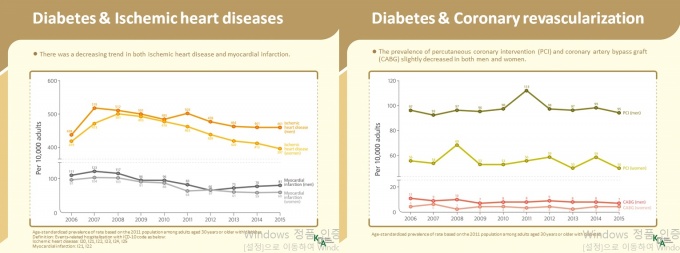 2006년부터 2015년까지 당뇨병 환자 1만명당 허혈성심질환 유병률은 남성 438명에서 461명으로 소폭 증가했지만 10년 동안 꾸준한 감소치를 보였고, 여성의 경우 419명에서 397명으로 줄었다.