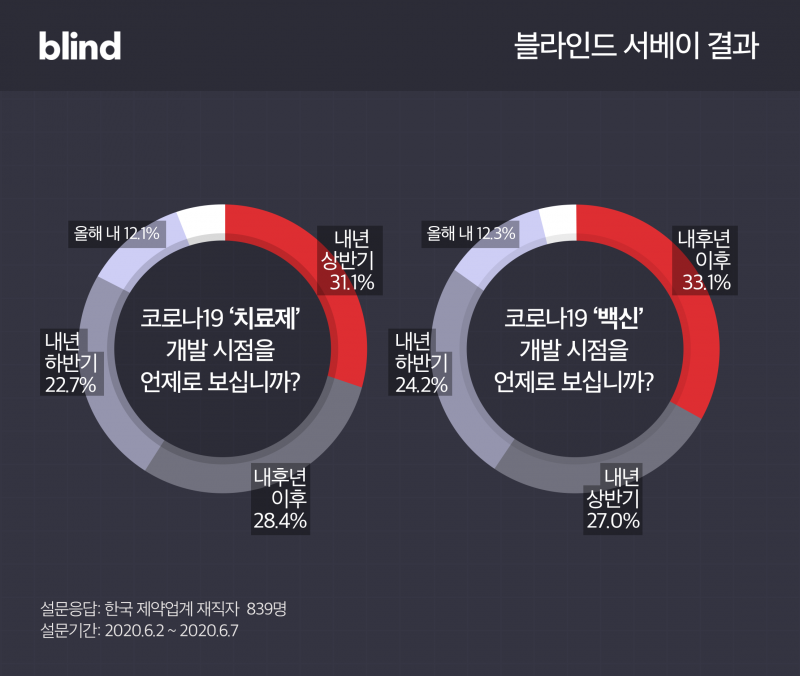 직장인 커뮤니티 블라인드가 최근 국내 제약업체 재직자 839명을 대상으로 실시한 코로나19 신약 개발 관련 설문조사에서 이 같은 결과가 나왔다.