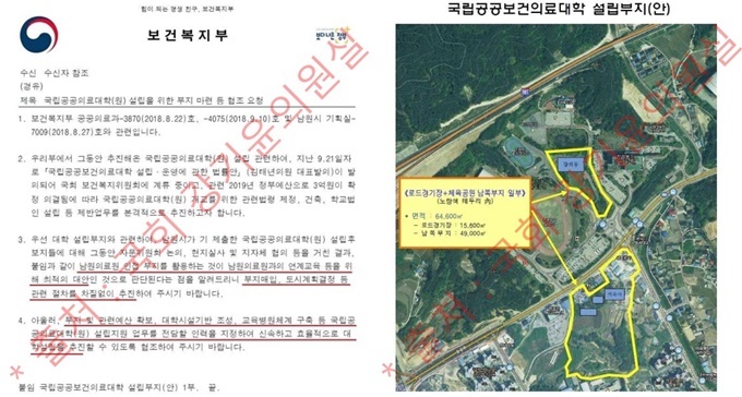 해당 문건에 따르면 보건복지부는 2018년 8월 22일 남원시에 공문을 보내 “전북 남원에 공공의대를 설립하기로 했으니, 조속한 시일 내에 설립부지(안)을 검토해서 제출하라”고 지시했다.