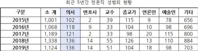 같은 시기 전문직 성범죄 현황도 의사(136명), 기타(703명), 종교가(104명), 예술인(98명), 교수(51명), 언론인(18명), 변호사(14명) 등이다.