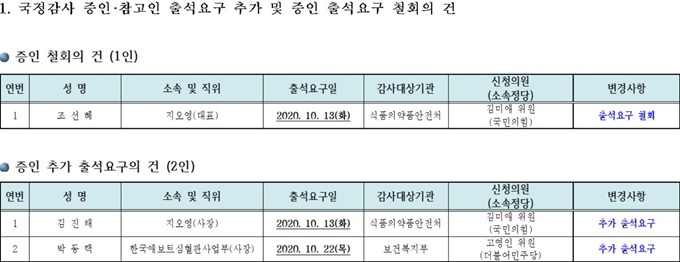 13일 국회 보건복지위는 이날 오전 식품의약품안전처(식약처) 국감에 앞서 ‘국정감사 증인·참고인 출석요구 추가 및 증인 출석요구 철회의 건’을 통과시켰다.