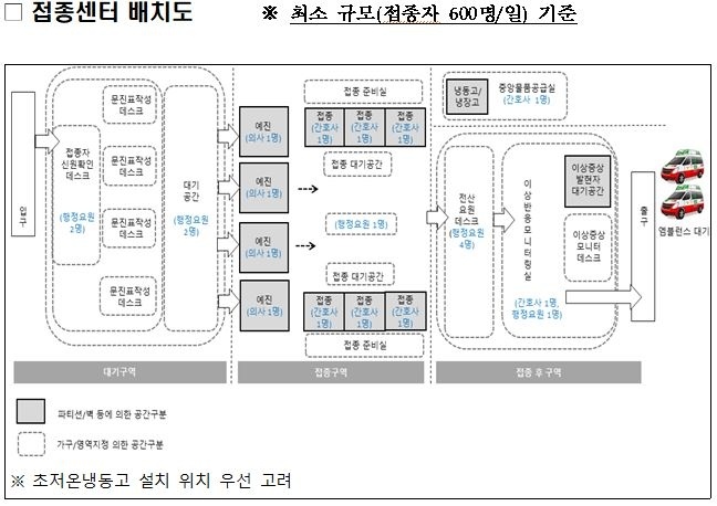 접종센터는 하루에 많게는 3000명이 접종하게 되는 점을 고려해 자연환기가 가능하고 거리두기에 충분한 면적을 갖춘 지상 시설·초저온 냉동고 24시간 가동을 위한 자가발전시설 보유·접종 전·후 대기시설 확보 용이·교통편의성 양호 등의 요건을 충족하도록 세부 기준을 정했다.
