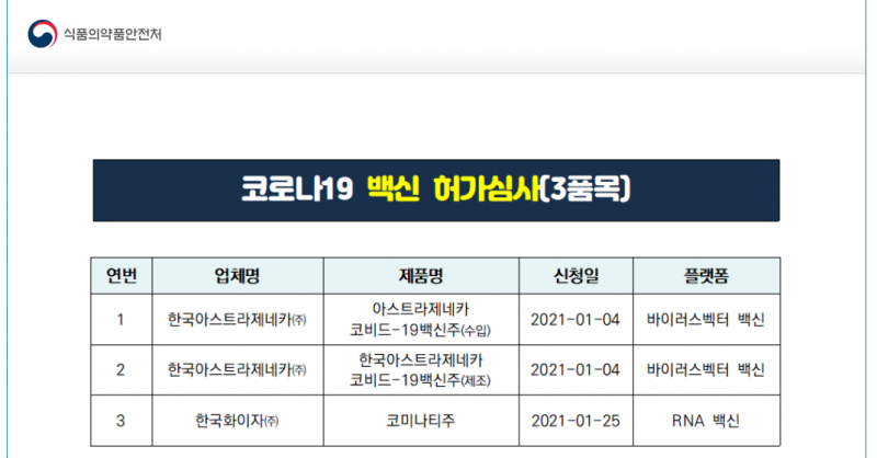 지난 4일 아스트라제네카는 식약처에 정식품목허가를 신청했다. SK바이오사이언스가 위탁생산하는 국내 제조방식과 수입 제조방식 두가지를 신청한 상황이다.