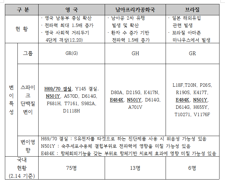과학 전문지 네이처지는 영국 변이바이러스는 전파력과 치명율이 높고, 남아프리카공화국과 브라질에서 발생한 변이바이러스는 백신효과 감소에 영향을 주는 것으로 확인됐다고 발표했다.