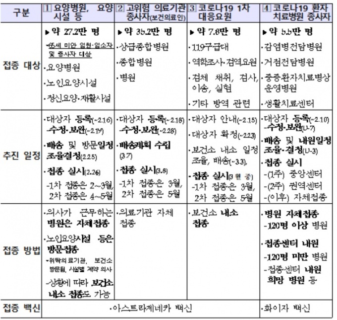 정부는 당초 1분기에 요양시설 노인·종사자 78만명을 접종하기로 했으나, 65세 이상 50만명이 대상에서 제외함에 따라 65세 미만 27만 2000명이 첫 대상자가 된다. 처음 사용하는 백신은 아스트라제네카 제품이다.