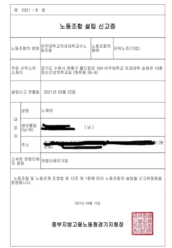 의료계에 따르면 아주대 의대 교수노조는 지난 3월 12일 중부지방고용노동청경기지청으로부터 노조 설립 신고증을 교부받았다.