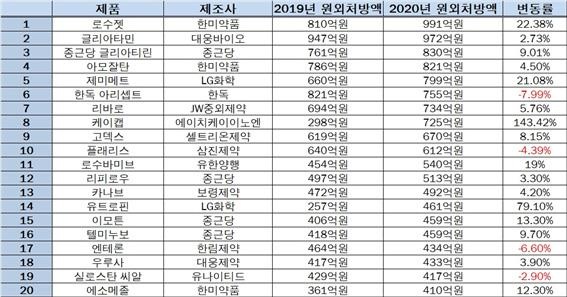 한미약품은 3개 품목이 순위 내 포함됐다. 처방 1위 품목인 ‘로수젯’과 3위 ‘아모잘탄’과 함께 항궤양제 ‘에소메졸(에스오메프라졸)’이 20위로 나타났다.