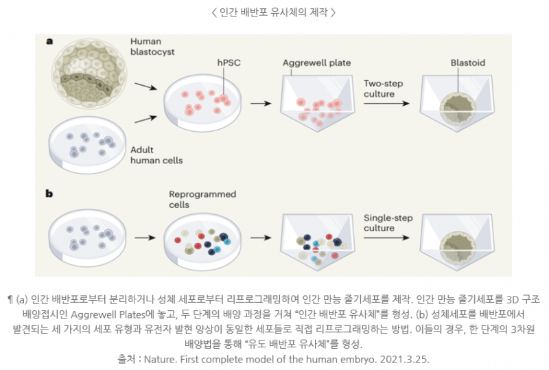 최근 네이처지에 따르면 미국 텍사스주립대 사우스웨스턴 메디컬 센터, 호주 모나시 대학 연구팀은 인간 만능 줄기세포(human pluripotent stem cells) 또는 성체 조직의 리프로그래밍으로 제작된 세포(cells reprogrammed from adult tissues)가 실험실 환경에서 초기 인간 배아를 모사하도록 자가 구조화되는 것을 제시했다.