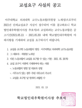 한편, 아주의대 교수노조는 지난 3월 22일 국내 최초로 의대교수 노동조합설립 이후 단체교섭 내용을 준비해 지난 4월 30일 교섭 요구서를 사용자인 재단에 발송했지만 답변이 오지 않아 재단을 상대로 단체교섭요구사실공고 이행가처분을 신청한 바 있다.
