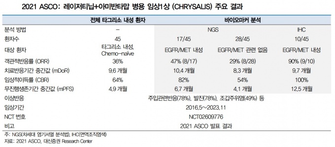 실제 미국임상종양학회 연례학술대회(ASCO 2021)에서 발표한 '레이저티닙+아미반타맙' 병용투여 결과를 보면, 객관적 반응률은 36%, 반응지속기간 중간값은 9.6개월이었다. 분석 기준일은 금년 4월이다.