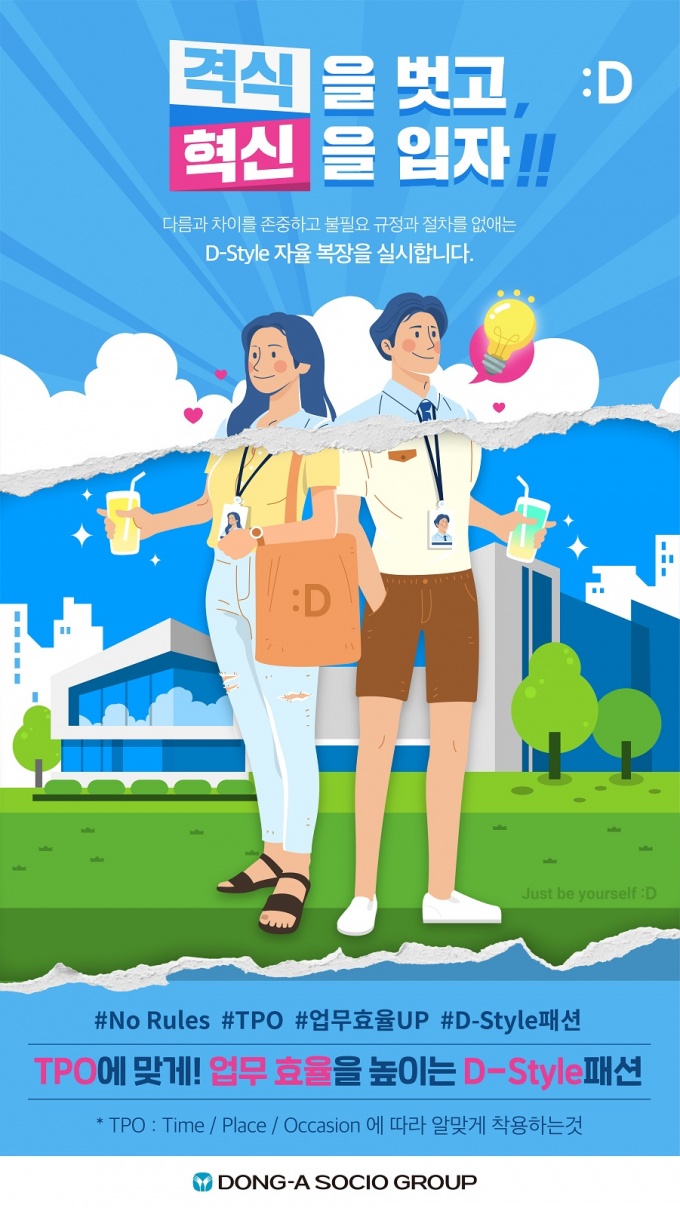 이에 따라 동아쏘시오홀딩스를 비롯해 동아ST, 동아제약 등 그룹 임직원은 복장에 대한 특별한 규정없이 시간(Time), 장소(Place), 상황(Occasion)에 맞게 업무 효율을 높이는 자율복장으로 근무하면 된다.