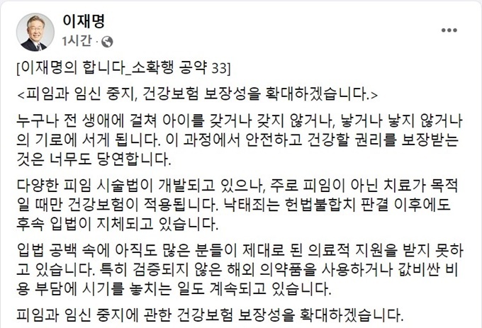 임신 중지 의료행위에 건강보험 적용도 추진할 전망이다. 이 후보는 “향후 개정될 모자보건법 상 임신중지 의료행위에도 건강보험을 적용해 안전한 의료기관에서 합법적인 의료서비스를 받도록 보장할 것”이라고 예고했다.