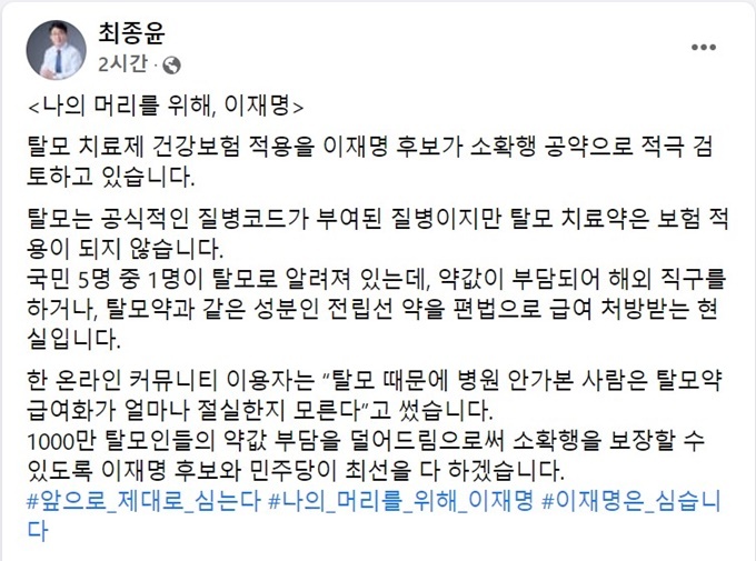 국회 보건복지위원회 최종윤 더불어민주당 의원은 4일 SNS를 통해 “탈모 치료제 건강보험 적용을 이재명 후보가 소확행 공약으로 적극 검토하고 있다”고 밝혔다.