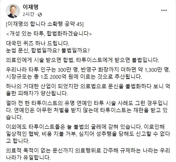 이 후보는 12일 SNS를 통해 “타투가 하나의 거대한 산업이 됐지만 의료법으로 문신을 불법화하다 보니 억울한 피해자가 양산된다”며 “문신을 하나의 산업으로 인정하고, 종사자들도 ‘불법 딱지’를 떼고 당당하고 행복하게 일할 수 있어야 한다”고 밝혔다.