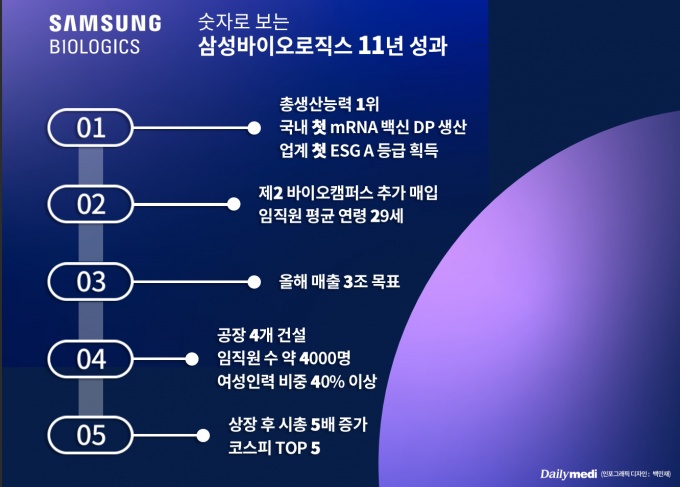올해로 창립 11주년을 맞이한 삼성바이오로직스가 'K-바이오'의 새 성공모델을 만들어나가고 있다. 단기간에 괄목한 성과를 내며 국내는 물론 해외 시장에서 굳건히 포지셔닝하고 있다. 제조업에서 축적한 노하우와 바이오를 결합해 '위탁생산개발(CDMO)' 분야에서 글로벌 플레이어들을 압도하고 있으며, 삼성바이오에피스 인수로 바이오시밀러, 신약 분야까지 영역을 확대한다. 이 같은 차별화된 경쟁력을 바탕으로 삼성바이오로직스는 2022년 매출 3조원 고지 점령에 도전한다. 이 같은 목표를 달성한다면 국내 제약·바이오업계 새 장을 열게 된다.