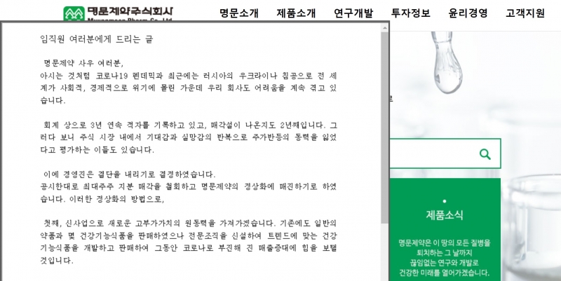 명문제약은 최근 홈페이지에 임직원 담화문을 게재하고 이 같은 의지를 천명했다.