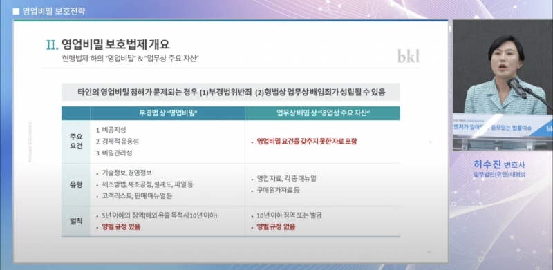 허수진 변호사는 “영업비밀 관리 규정이 취업규칙과 징계규정 등과 연계되도록 보완하고, 영업비밀 관리 조직 시스템을 구축해 정기적으로 모니터링 및 점검을 해야 한다”며 “지속적인 보안교육과 영업비밀 준서 서약서 등을 준비하고, 영업비밀자료 관리를 철저히 해야 한다”고 말했다.