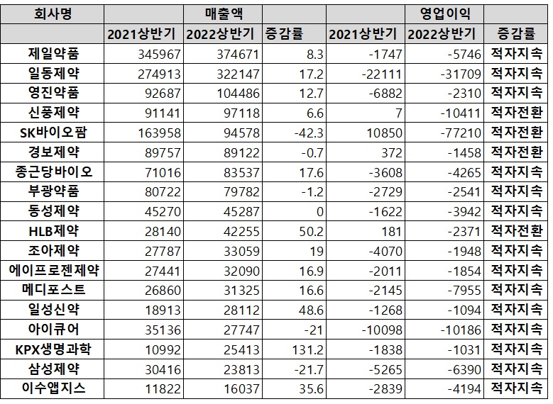 올해 상반기 영업손실을 본 업체는 제일약품, 일동제약, 영진약품, 신풍제약, SK바이오팜, 부광약품, 동성제약, 일성신약 등이다.