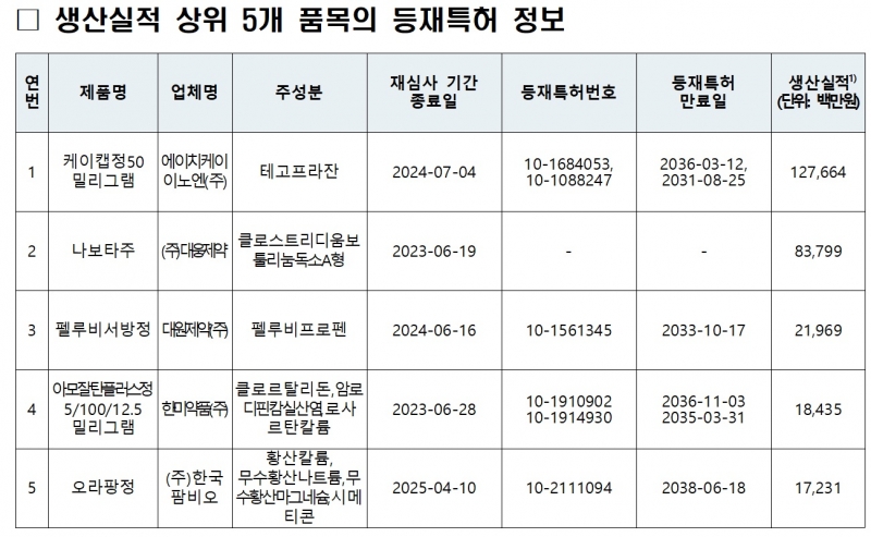 특히 생산·수입실적 상위 각 5개 품목에 대해 등재특허 외에 해당 성분 관련 미등재된 특허정보도 추가로 제공된다.